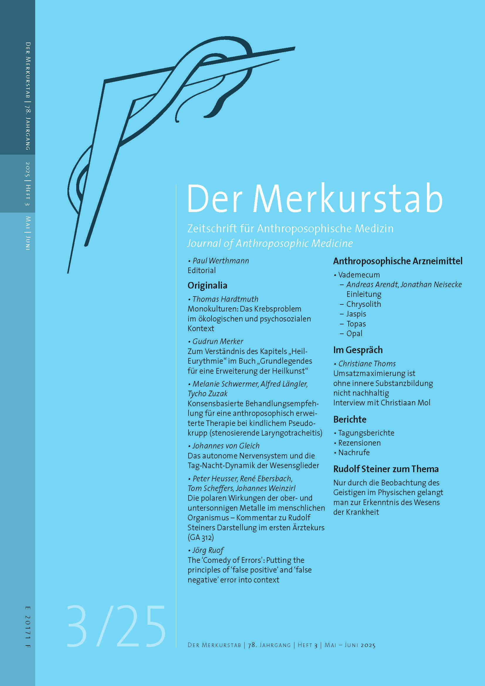 Kennen Sie den Merkurstab? Medizinische Fachartikel, Fallberichte aus der Praxis, anthroposophische Kunsttherapien und Arzneimittel, Interviews, Rezensionen und vieles mehr. 6 x im Jahr gedruckt und online. Werfen Sie gern einen Blick in die neue Ausgabe: hier. Editorial und Abstracts sind immer frei zugänglich. Die vollständigen Beiträge – insgesamt über 7000 Artikel – können Sie als Abonnent:in lesen: hier. Sie überlegen noch? Einen schnellen Überblick zum aktuellen Heftinhalt bekommen Sie mit unserem 2-monatigen Newsletter. Melden Sie sich gern unverbindlich an und bleiben Sie so auf dem Laufenden: hier.